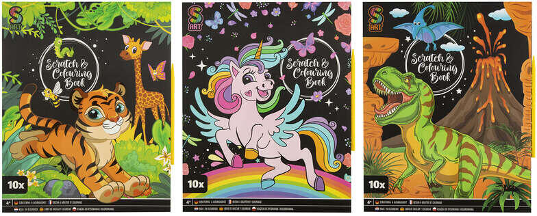 Kaparós és színezős kreatív füzet: 10 db kép, kaparó tollal ??? Fedezd fel a varázslatos kaparós és színezős füzeteinket! 10 db 26x21 cm-es lapon varázslatos képek várnak rád, amiket te magad hozhatsz létre. Egyszerűen kapard le a fekete réteget a kaparó tollal, és csodálatos színek bukkannak elő! Mit rejt a füzet? 10 db kétoldalas lap: az egyik oldalon kaparós kép, a másikon színező felület található. 1 db kaparó toll a könnyű használatért. Három izgalmas minta közül választhatsz: tigris a dzsungelben, egy szivárványon lovagló unikornis, vagy egy félelmetes T-Rex vulkánnal. Fejleszd a finommotorikádat! A kaparás és színezés fejleszti a finommotoros készségeket, a kreativitást és a koncentrációt. Tökéletes szórakozás kicsiknek és nagyoknak egyaránt! ? Méret: 26 x 21 cm