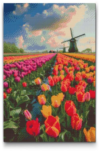 Gyémántszemes kirakó - Szélmalmok a tulipánmezőn Méret: 40x60cm, Keretezés: Kartonlemezen, Gyémántok: Kerek