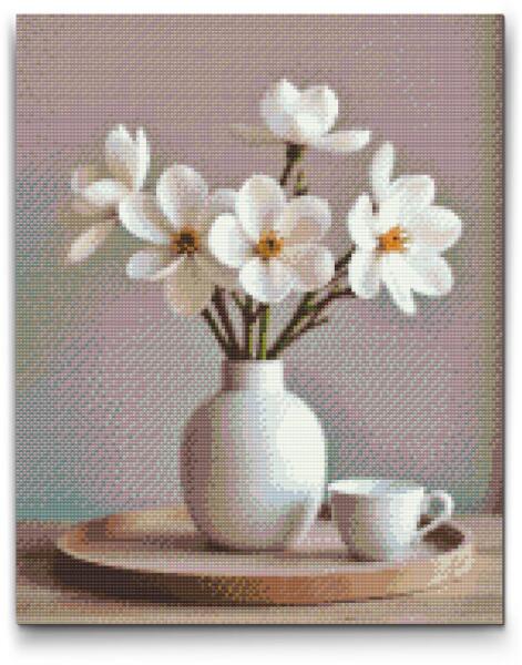 Gyémántszemes kirakó - Tavaszi fehér virágok vázában Méret: 40x50cm, Keretezés: Kartonlemezen, Gyémántok: Kerek