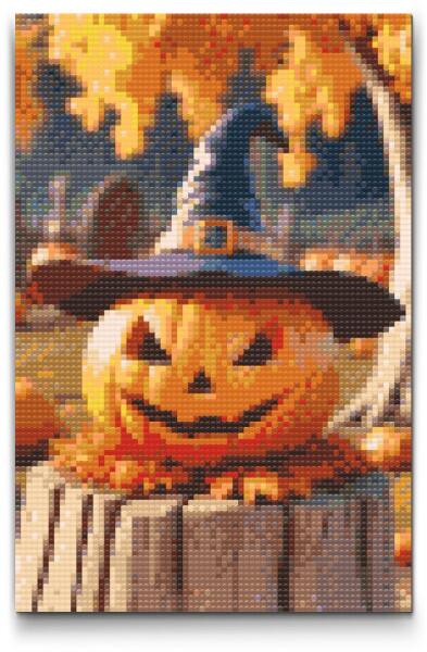 Gyémántszemes kirakó - Tök boszorkány kalappal Méret: 20x30cm, Keretezés: Kartonlemezen, Gyémántok: Kerek