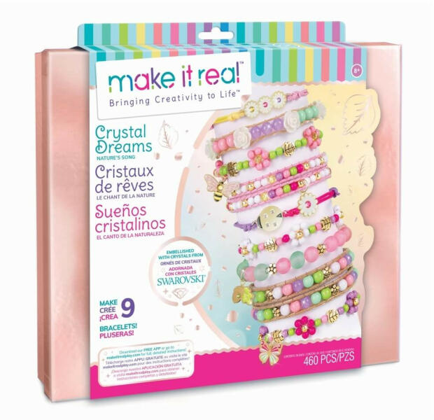 Engedje szabadjára a kreativitását és alkosson ragyogó ékszereket!Lépjen be az ékszertervezés csillogó világába a Make It Real Kristály álom szettjével! Ez a természet ihlette készlet mindent tartalmaz, amire egy feltörekvő dizájnernek szüksége lehet, hogy megalkossa saját, egyedi karkötő kollekcióját. A szett különlegességét a valódi Swarovski kristályokkal díszített, bájos medálok adják, mint például a méhecske, pillangó vagy virág figurák, melyek eleganciát és fényt visznek minden alkotásba. A kreatív lehetőségek tárháza végtelen a több mint 460 alkatrésznek köszönhetően. A csomagban található színes fonalak, a sokféle formájú és árnyalatú gyöngy lehetővé teszik, hogy gyermeke összesen 9 egyedi karkötőt készítsen, melyeket büszkén viselhet, vagy akár a legjobb barátnőjének is ajándékozhat. Az ékszerkészítő folyamat nemcsak szórakoztató, de fejleszti a finommotorikus készségeket, a koncentrációt és a szépérzéket is. A rendszerezett és tiszta alkotófolyamatot a mellékelt praktikus tárolótálca biztosítja. Ebben minden gyöngynek és kiegészítőnek megvan a maga helye, így az apró alkatrészek nem vesznek el, és a munka befejeztével a tárolás is egyszerű. Ez a Swarovski kristályos ékszerkészítő szett tökéletes ajándék minden kreatív gyermek számára, aki szeretné megcsillogtatni egyéniségét. A játék előnyei