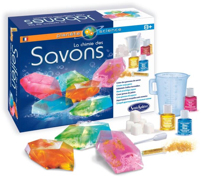 Opremljeni s pipetami, barvili in zlatim bleščicami, bodo mladi kemiki lahko obarvali tekoče milo, ki so ga vlili v kalupe v obliki kamnin! Ko se ohladijo, bodo iz kalupov vzeli čudovite milne oblike draguljev. Z njihovim največjim zadovoljstvom se lahko ti milni izdelki z videzom smaragda, turkiza ali opala uporabljajo za umivanje rok! Ta komplet vsebuje znanstvena navodila, ki pojasnjujejo izvor mila in osnovna načela saponifikacije.